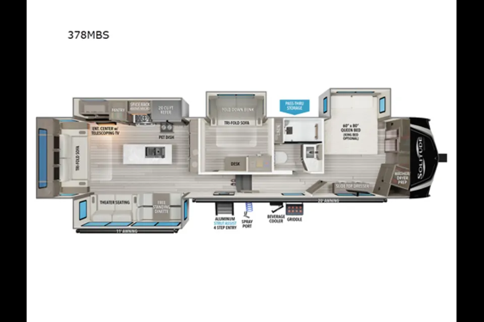 This RV is super roomy, making it perfect for families, couples, or anyone who just appreciates a little extra space on the road. It’s fully equipped with all the comforts of home, including a washer and dryer (a total game changer for longer trips), a spacious kitchen, cozy living area with a fireplace, and a private master bedroom for winding down after a day of exploring. This unit features a private mid room (separate from the master) with a fold out sofa and a twin bunk for a teenager. Or if you have young kids, it is the perfect quiet place to nap them with the door shut while you enjoy the rest of the RV!