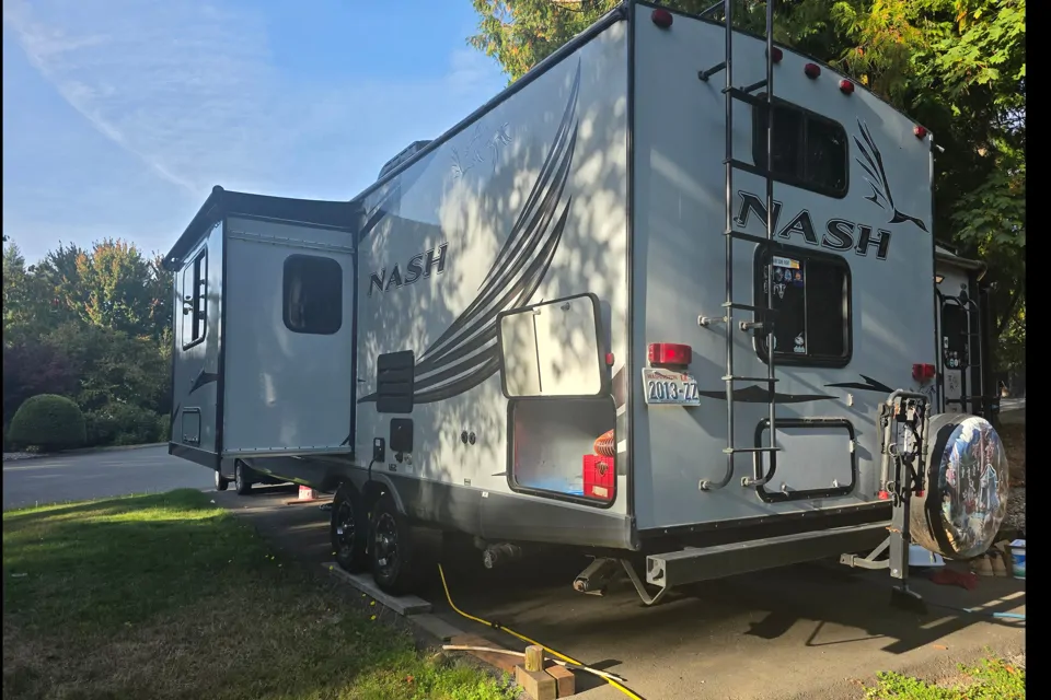Beautiful Nash RV sleeps 6 people (2 on the queen bed, 2 on the dinette, and one on each bunk), full kitchen, and dry bath. This RV comes with plenty of storage compartments outside, and under the queen bed, and access under the dinette seats. Linens for beds provided, towels, pots, pans, and dishes for 6, camp chairs. Bike rack included on RV for 3 bikes, propane BBQ also included.