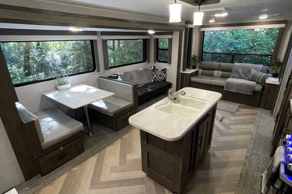 Modern Interior: Enter a world of contemporary elegance with stylish furnishings, tasteful decor, and large windows that bathe the space in natural light. This is your sanctuary on the road, blending luxury with functionality.