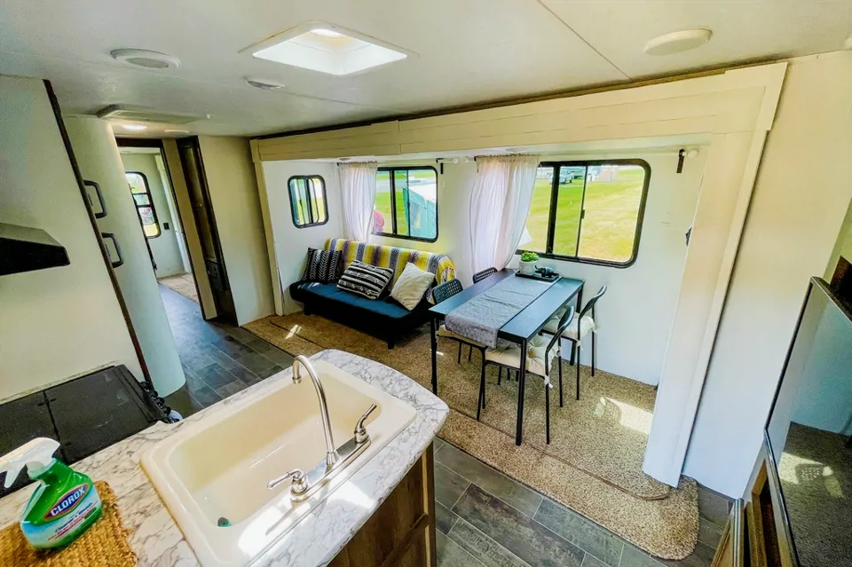 "Benny the bullet" is a 35ft spacious home on wheels featuring a separate bunkroom in the back with its own slideout and separate door. Features a full sized twin bunk bed with memory foam mattresses, not your typical RV bunks. Perfect for the kids! Enjoy your morning cup of coffee without waking the mini humans! You will have plenty of room to cook and entertain in this beautifully designed travel trailer. Futon couch in the main living room that folds out to a bed provides a cozy space to watch a movie or show with the complimentary Roku we provide. Updated dining table set makes you feel right at home instead of the typical dated rv dinettes. Upgraded memory foam queen bed in the master bedroom. Bathroom features its own door to the exterior making it easily accessible from outside without walking through the main living space. Outdoor shower for rinsing of furry friends or kiddos after a long day outside. Thermal ALL-WEATHER package and ready for year round travel with a 13,500 BTU AC unit and a 30,000 BTU heater! Benny has TONS of storage space as well as all your basic kitchen appliances.