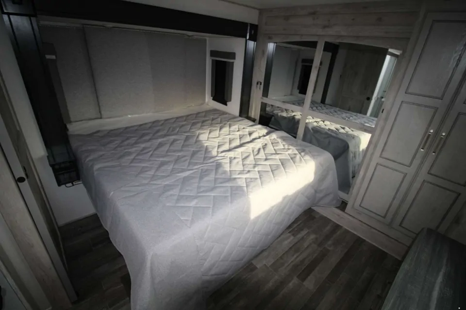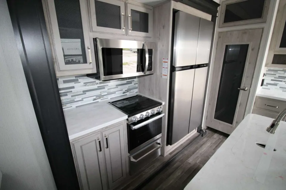 Luxury model. Residential sized fridge. Walk through bathroom. Washer dryer hook ups. Auto level. Dual propane tanks with Bluetooth monitoring. King sized bed and 2 pull out couches to sleep 6 for glamping.