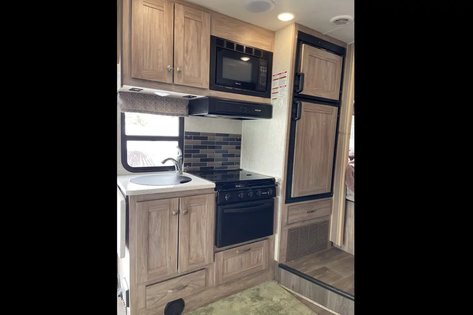 The queen size master bed is extremely comfortable, with a privacy curtain and right next to the 3/4 bath with toilet and shower. The bathroom sink is right next to the bathroom. Dinette with leather seats converts to a bed for extra room for sleeping. Oven with range-top and a microwave. Sound system is amazing with optional blue-tooth connection, and options for listening to tunes with speakers inside and out.