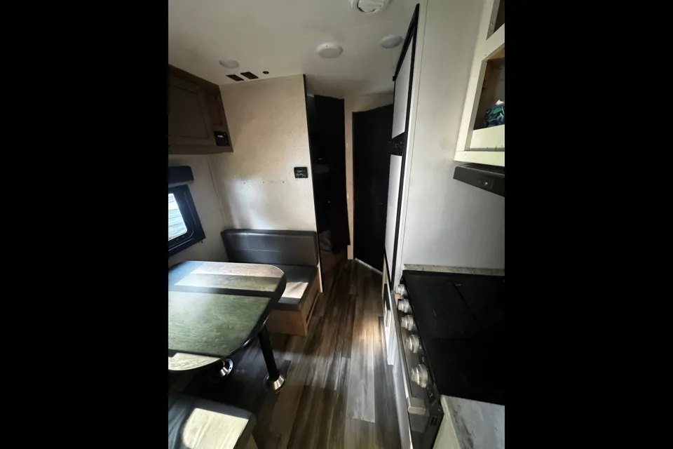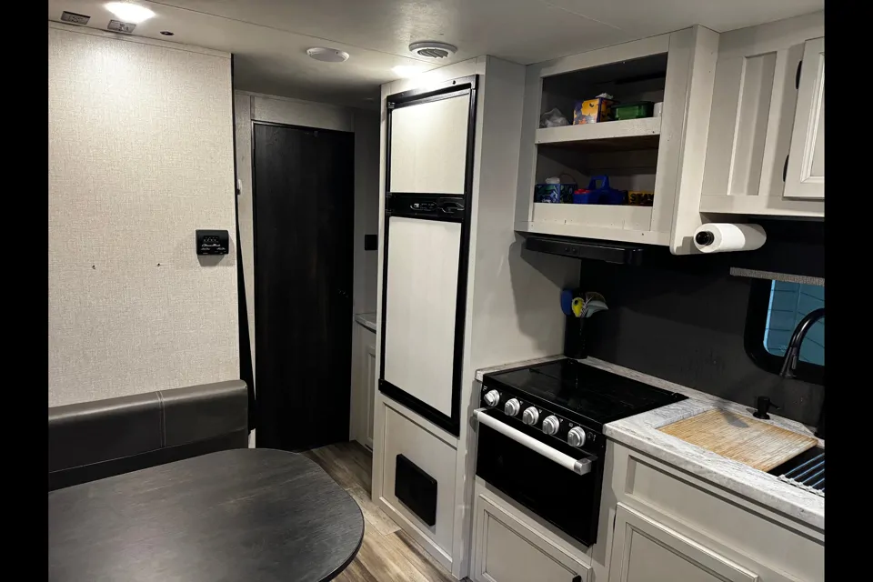 Kitchen & Appliances: Fully equipped with a 3 burner propane stove, propane oven (can fit a 14 inch pizza snugly), large kitchen sink with soap dispenser, fridge, and freezer.