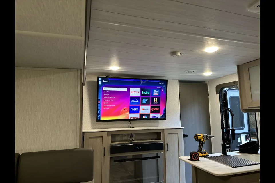 You’ll get the best of both worlds: cozy inside comfort and smart outdoor features that make campground life simple. Kick back under the power awning, enjoy the electric fireplace on cooler nights, and relax with 50” 4K TVs in both the living room and the master bedroom. Hot water is a non-issue thanks to on-demand hot water, and the 100W solar helps keep things topped off while you’re out enjoying the weekend.