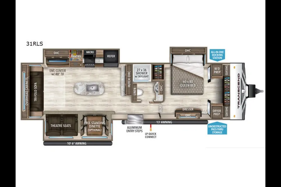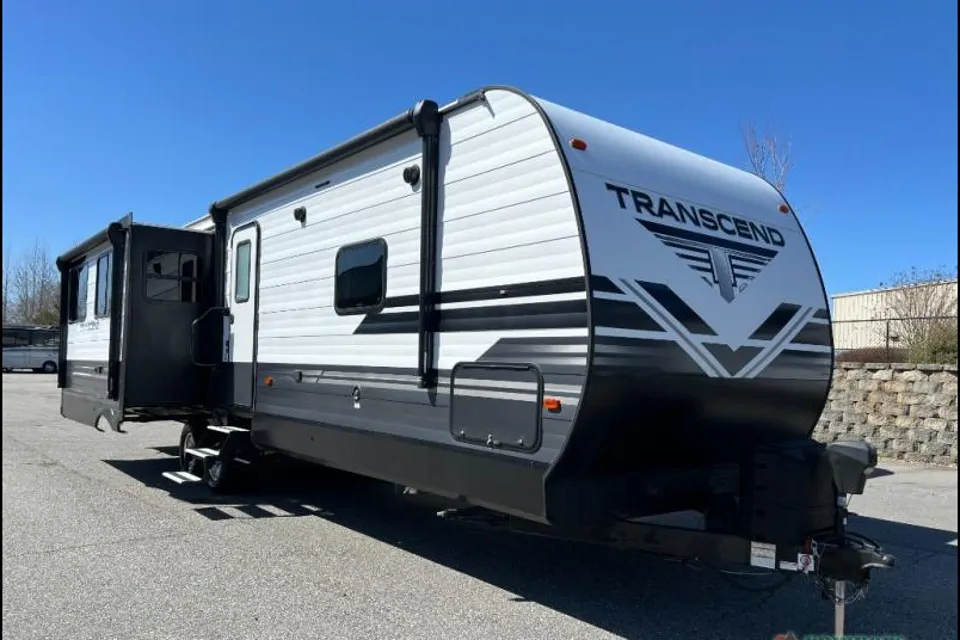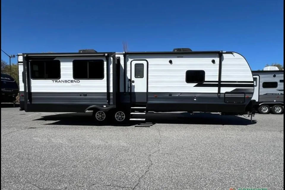 With two electric awnings, an exterior pass-through storage area, and a front private bedroom, you will have a hard time finding a reason not to extend your camping trip in this Transcend 31RLS travel trailer! The kitchen island will make your meal prep a breeze and the large pantry is big enough for you to bring along all of your favorite goodies. When you're ready to wind down your nights, you can head to the rear living area and relax on either the tri-fold sofa or the theater seats while watching your favorite movie on the 40" TV, and if you're not much of a movie person you can play a card game at the free standing table!