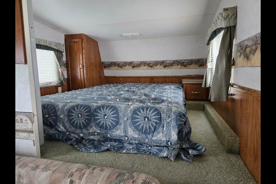Camper is a 5th wheel with gooseneck adapter. Camper comes with a regular size queen, not the smaller camper queen. Comes will linens for all the beds. Has toaster, coffee maker, pots and pans, strainer, bowl, knives and other kitchen tools showen in picture. All kitchen appliances work and has new water heater. Has awning and patio mat. Older solid steel construction creates stable trailer.