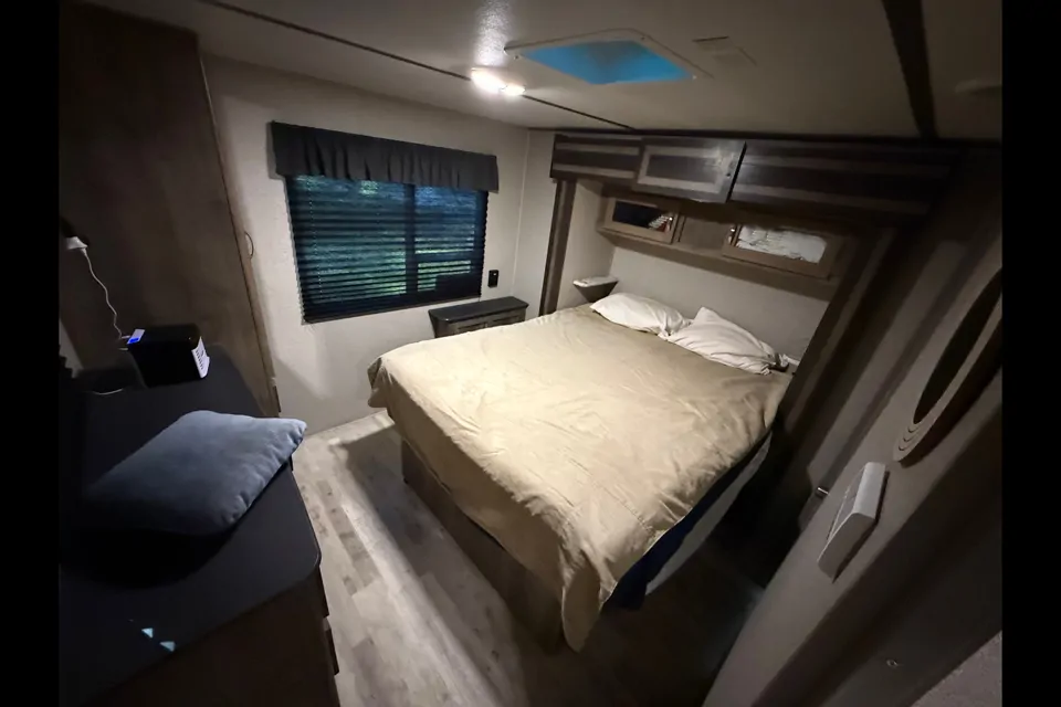 Spacious camper with large kitchen /seating area big bathroom and private bedroom with queen bed , nice camper for a peaceful stay on your favorite campground..comfortable place to sit at table or recliner.