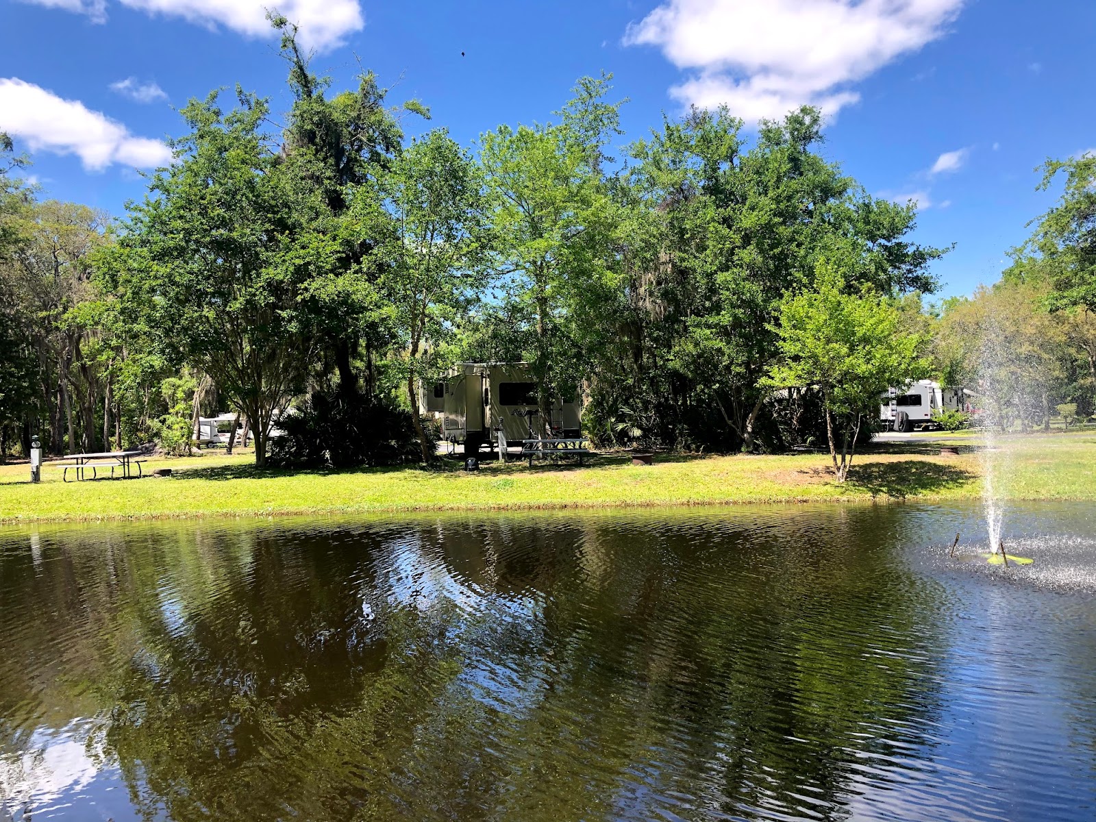 La propriété peut accueillir tous les formats de VR, y compris les gros motorisés et les fifth wheels, avec des emplacements traversants en béton de 60 pieds dotés de socles électriques mesurés 50/30 ampères, branchements d'eau, raccords d'égout et station de vidange. Des emplacements pour tentes sont également disponibles. Parmi les commodités supplémentaires, on retrouve le service de propane, une buanderie, des douches et un accès Internet fiable, en plus de foyers et de tables bistro à chaque emplacement.