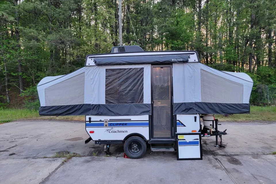 The 2020 Coachman by Forest River popup trailer offers a cozy and convenient camping experience. Featuring 2 Full beds for sleeping, a compact kitchenette equipped with a 2-eye burner, sink, refrigerator, and dinette area for meals and relaxation, it's designed to comfortably accommodate small groups or families. With its lightweight construction and easy-to-tow design, it's perfect for exploring various campsites and enjoying outdoor activities.