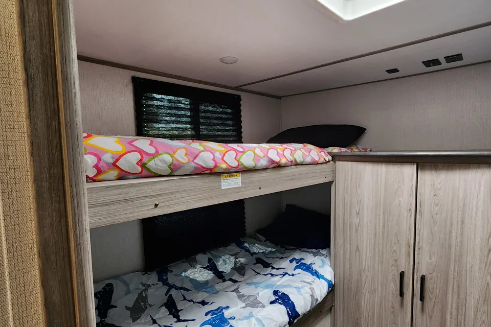 This is a cozy, spacious, and family friendly travel trailer. It offers 4 single bunk beds in a separate room. Additionally, the main room has a door that allow for privacy all around the trailer.