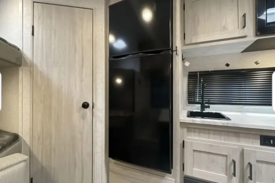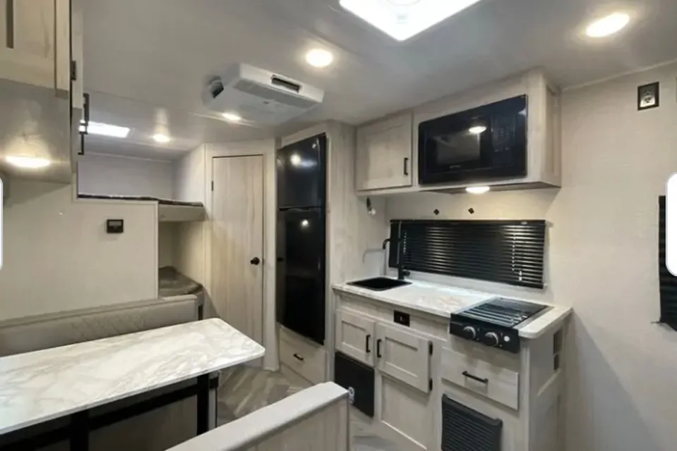 This beautiful small 17ft RV will offer you everything you need to enjoy the best camping experience. You have a queen Murphy bed with a mattress topper for extra comfort. A double bunk beds for your kids to sleep comfortably as well.