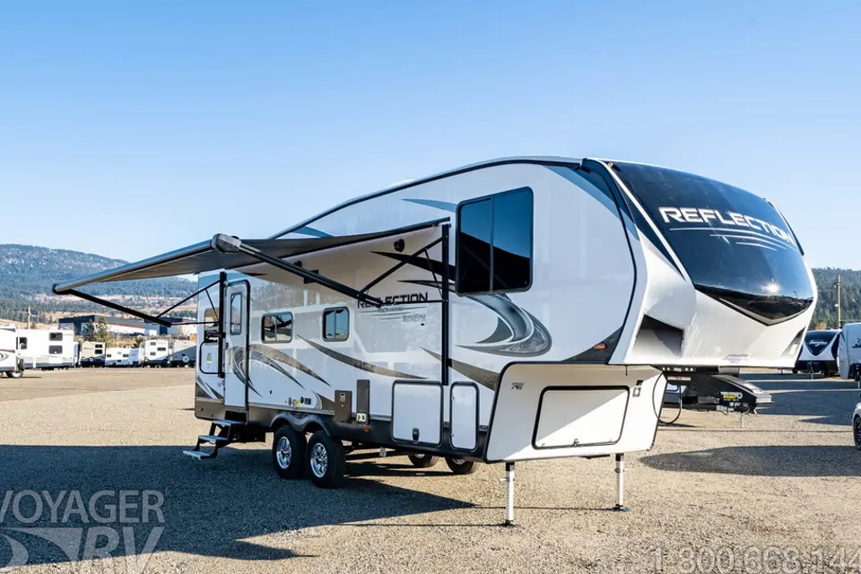 The 2022 Grand Design Reflection 260RD is a lightweight, half-ton towable fifth wheel designed for couples, known for its rear dinette and single slide-out. It features a rear dinette that converts to a sleeping area, theater seating, and a centrally located smart TV. The kitchen includes ample counter space, tall cabinets, and a Furrion three-burner stove. The bathroom has a porcelain toilet, a large vanity, and a spacious shower. The master suite features a residential-size queen bed and wardrobe space. Very clean and well kept camper. Reclining couch has heated and massaging reclining seats.