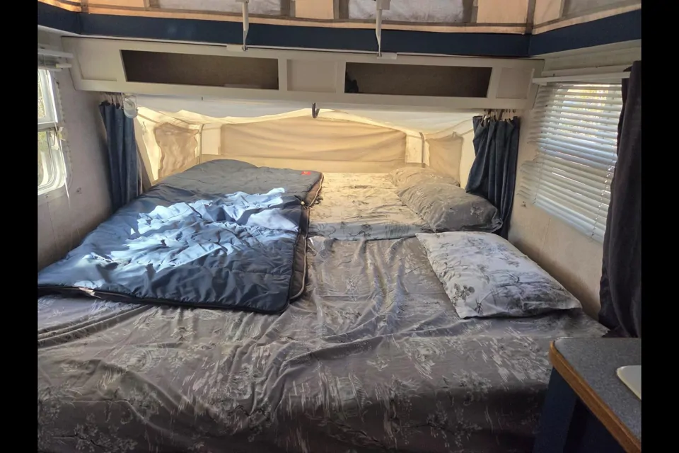 🎒 Compact but spacious – Smart design with two fold-out queen beds + convertible dinette and one convertible couch.