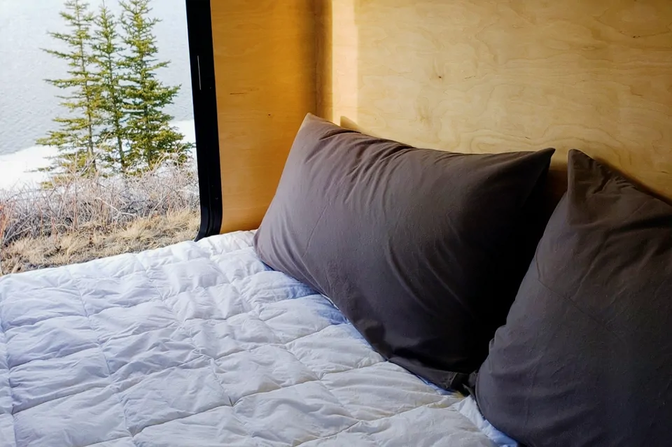 Daisy may be small and light, but she can comfortably sleep any two people on her custom made 5” mattress measuring 58.5” wide (virtual Queen) X 80.5” long. That’s a 6-foot 8-inch long mattress!