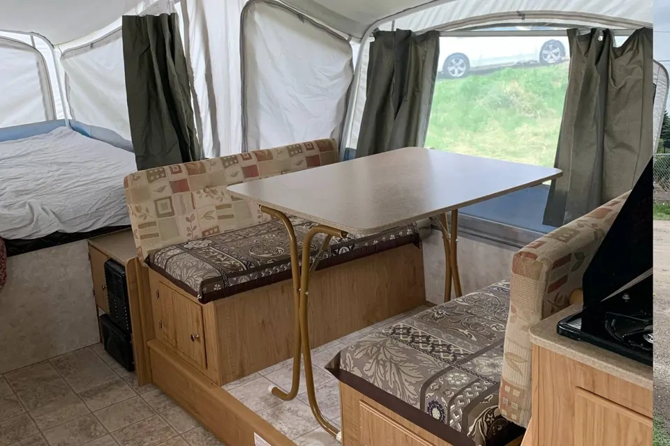 With two slide out beds on each end of the trailer (Both are king beds! ) , and the dinette table turns into a single bed. The dinette is a slide out, which creates a spacious & practical floor plan, great for a couple or family. There is also more seating, with a bench on the side with tons of storage underneath all the seating in the trailer. There are windows EVERYWHERE, they all open for more airflow, and allow so much sunlight in its wonderful. The windows also all have curtains as well when night time comes. The furnace, mini fridge and stove works great, so even on cold nights you and your family will stay warm with the canvas.
