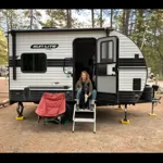 14 foot mini toy hauler. 1 queen sized Murphy bed, space for dirt bikes or small quads. Plenty of room for mountain bikes, paddle boards or all your other toys. Lots of space to relax inside on those rainy days too, just lift the bed up! Pets welcome. Please bring your own linens, mattress protector included and cleaned each use. Back up camera included, just plug screen into your vehicles 12V plug. All dishes, coffee cups, pots and pans included. Some basic snacks and coffee in trailer for guests use. The washroom is user friendly for smaller guests, it's a tight space. The hot water tank takes about 30 mins to warm up but then is very hot! Watch your fingers or showers temperature. The furnace heats up the small space very effectively. The batteries will last about 5 days in average temperatures without sun exposure for the solar panels. If you have sun, the batteries are good for 10days, just keep in mind, any fans use (furnace or overhead fan) use a lot of battery. I have just towed this trailer for 12,000kms. All around lower BC and up to the Yukon. It handles very well and is a dream to drive. Backing in takes finesse as its a short trailer, small increments will win for you here. If you crank the steering wheel she will jack knife and you'll have to start again. The back ramp goes down for loading, or, for a beautiful view from bed. Feel free to add any stickers to the collection :) if you need more power, I have a jackery available for rent with the trailer. There is also a spare solar panel that can be included upon request if you feel you may require. Off grid, the trailer has 3 USB plugs you can use. Fridge only runs off batteries so no worries to turn it off on long travel days. Freezer works very well.