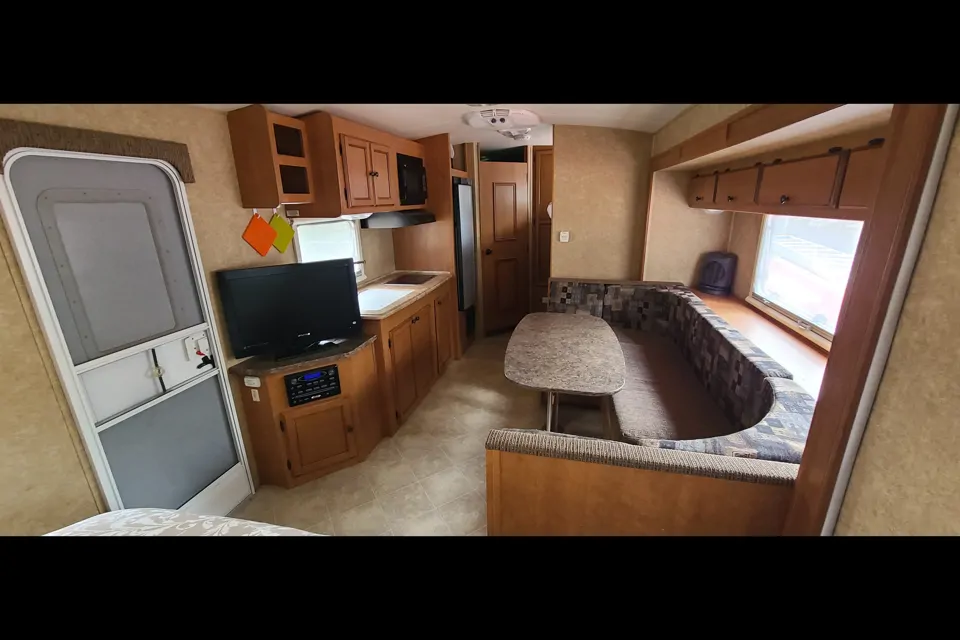 Step inside. Seven feet of glorious headroom welcomes you. You feel tall. Important. Regal. The space is cleverly arranged, like a Swiss Army knife, yet warm like Grandma’s kitchen. It sleeps six—but not like sardines. A queen bed awaits the grown-ups, a dinette turns into a dreamy nook, and bunk beds give the kids bragging rights at show-and-tell. The black-out blinds keep it cool in the heat and dark when you need it.