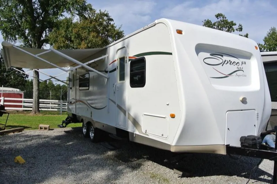 2009 32' travel trailer (21RS) RV rental, $700/wk, sleeps up to 10, 1/2 ton towable, double bunks in the back, Queen in front, Slide Out in center, Sofa Bed, A/C, Microwave, Stove, Oven, Large Shower, Large Storage Area, Dinette, Awning. You will need:1/2 ton (or larger) tow vehicle (trailer is approx. 6,274lbs dry, 1,200lbs cargo capacity, 7,500 lbs GVWR), bedding, towels, paper towels, and garbage bags, A powered site is recommended for stays longer than three days. Add: Honda EU2000i Generator adds $15/day.Included are: pots & pans, plates, cups, cutlery, utensils, camping chairs, fresh water hose, ground mat, leveling blocks, tarps, extension cord
