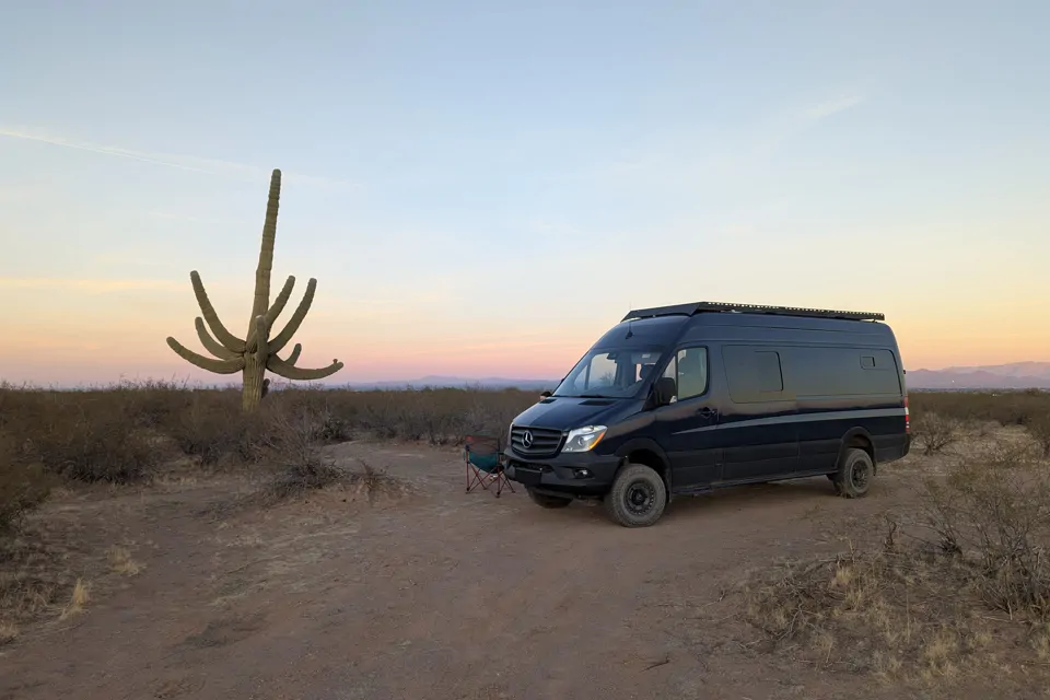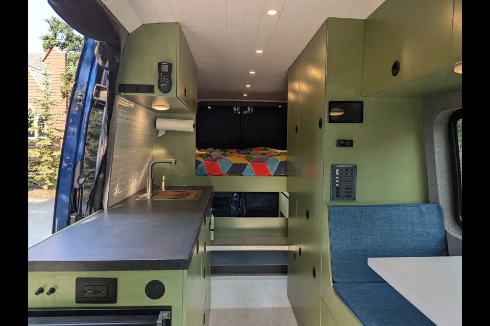 Explore the open road with our Mercedes Sprinter 4x4 custom camper van, designed for comfort and adventure in all four seasons!