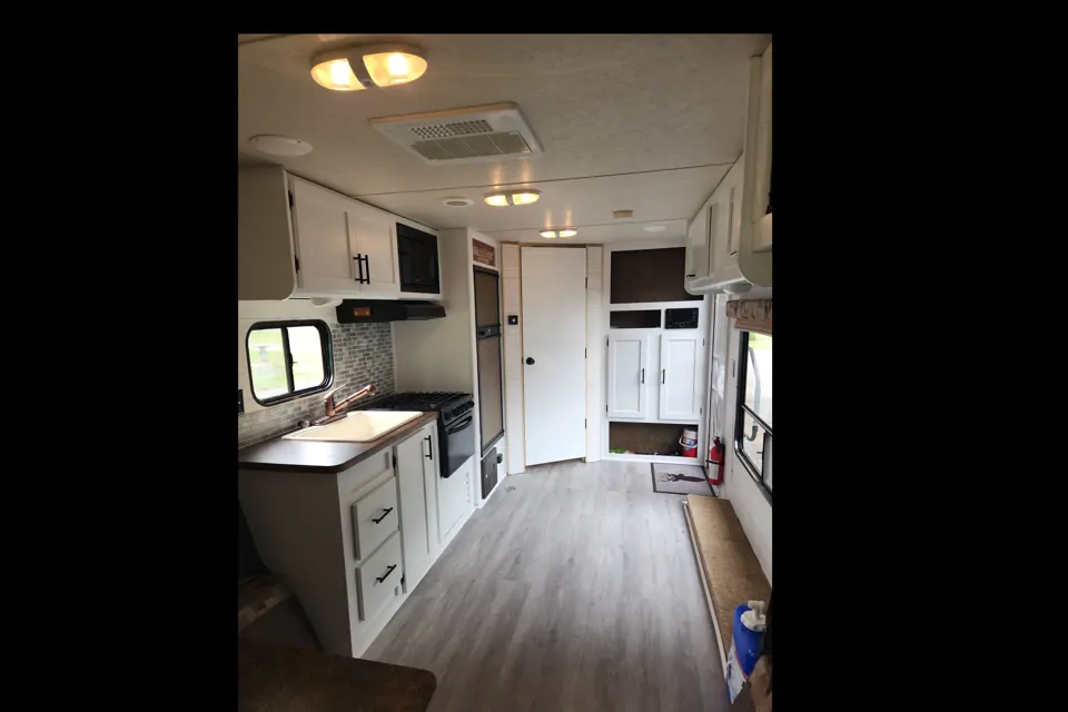 This 26 foot has 1 private bathroom, a walk through full bathroom, kitchen, seating for 6 at the table. Table folds down to make a queen bed, or two separate single beds. Back opens up for fresh air. Freshly renovated for a more modern interior.