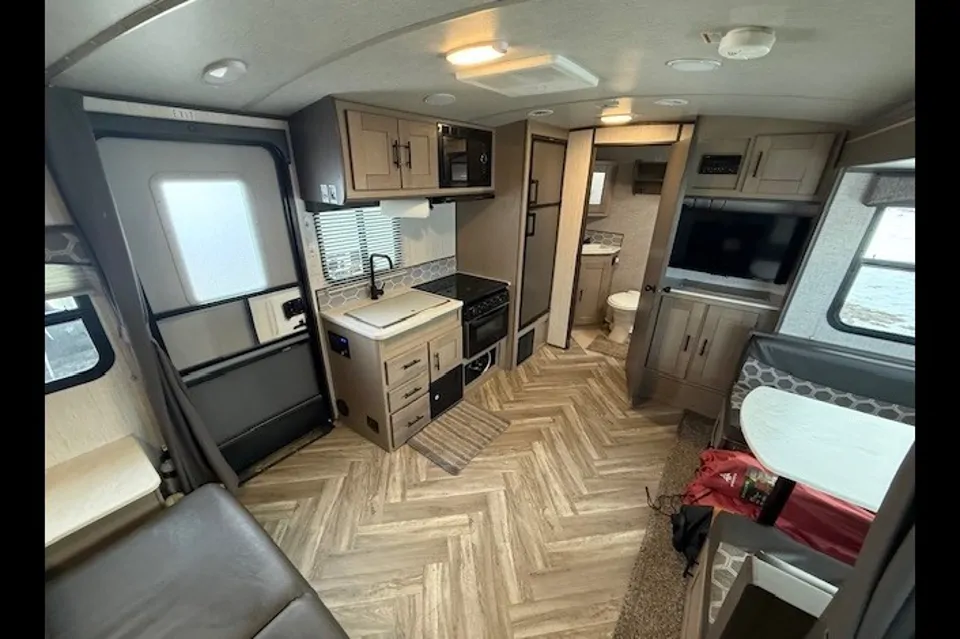Inside, you’ll find a bright, open-concept living space featuring a cozy Murphy bed that folds away to reveal a comfortable sofa, giving you maximum flexibility day and night. The kitchen offers storage, modern appliances, and counter space for preparing meals on the go. A private rear bathroom provides a shower, vanity, and storage.