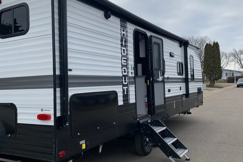 Fully equipped 2022 keystone hideout 1 slide out private master bedroom Sleeps 8 int / ext shower int/ ext kitchen 2 fridge Heat and AC. Can deliver on site