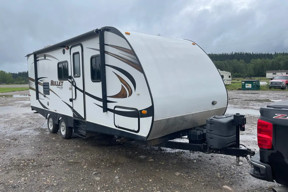 This travel trailer is a 2014 Keystone Bullet Ultralight.