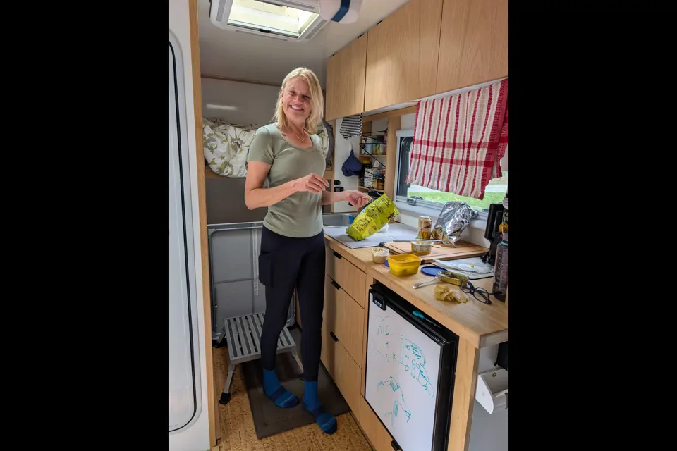 Our Vinny is our dream machine we finally invested in that is so capable and nibble for its size. It's a gas engine with a large solar array system, and mostly all electric. The shower is a portable system that can be used inside or outside. We include chairs and linen for your comfort and a full orientation on the systems before you start your trip in the Rocky mountains.