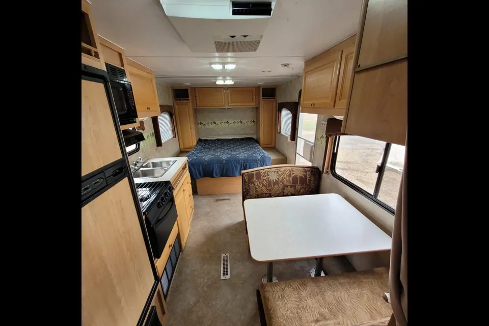 This well-laid-out RV is perfect for families or small groups, comfortably sleeping up to six people. The front features a queen bed with surrounding storage, offering a cozy space to unwind after a day outdoors. A set of built-in bunk beds provides ideal sleeping space for kids or extra guests, complete with a privacy curtain.