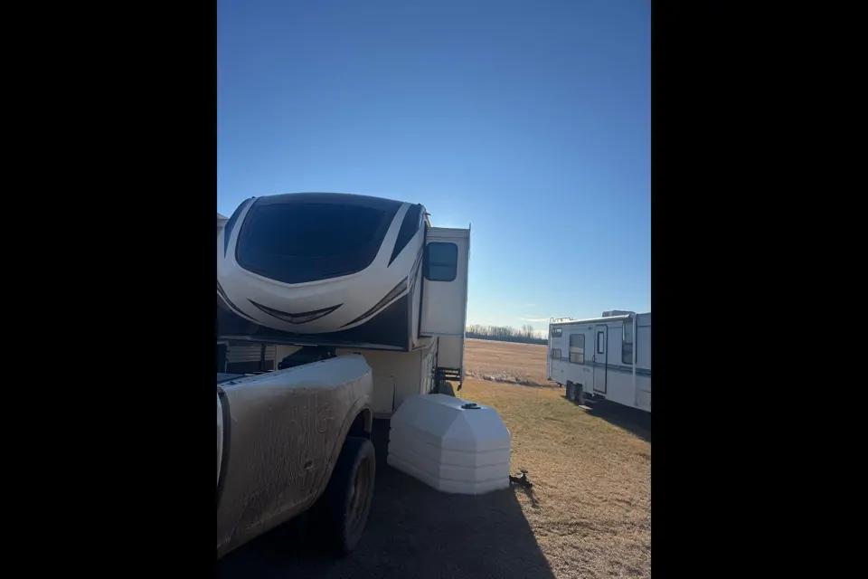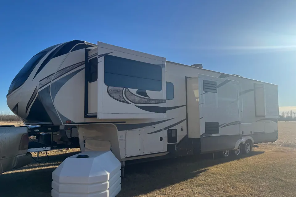 42ft 5th wheel camper, it has a nice spacious living room with two pull out couches and theatre seating ( massages and heater), an electric fireplace with a telescopic TV, outdoor and indoor radios, has a nice full side fridge that can be either run off propane or electric. A 3 burner gas stove with an oven, an island with a sink which can also be used as counter space with the sink covers. A nice big pantry. A nice be microwave. It also comes with a washer/dryer combo. A dining table that seats 4. 2 AC units one in the living room and one in the master bedroom. The AC units can also be run as heaters as well. A gas furnace. A great big shower inside a beautiful bathroom. The master bedroom has a queen size bed with tons of closet space. Also comes with a tv inside the bedroom. The trailer it self is a triaxle trailer weighing a total of 16,000lbs dry. It has automatic levelers on it. It has two 30lb propane tanks. Outdoors you’ll find an outdoor entertainment centre along with an outdoor mini fridge. It has two 14’ awnings. Along with this beautiful camper it is also a toy hauler of sorts which is located underneath the master bedroom. The bed will lift up to the ceiling giving you a bit more room to fit even a golf cart in the back. With the bed down you can fit your atv or motorcycle in the back.