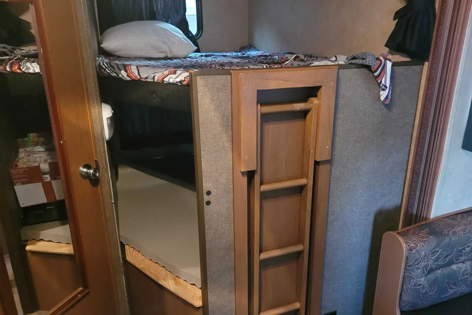 A set of double bed bunks in the right rear corner provides plenty of sleeping for the kiddos or extra guests. A ladder in the rear makes accessing the top bunk easy. Linens, blankets, and pillows are included.