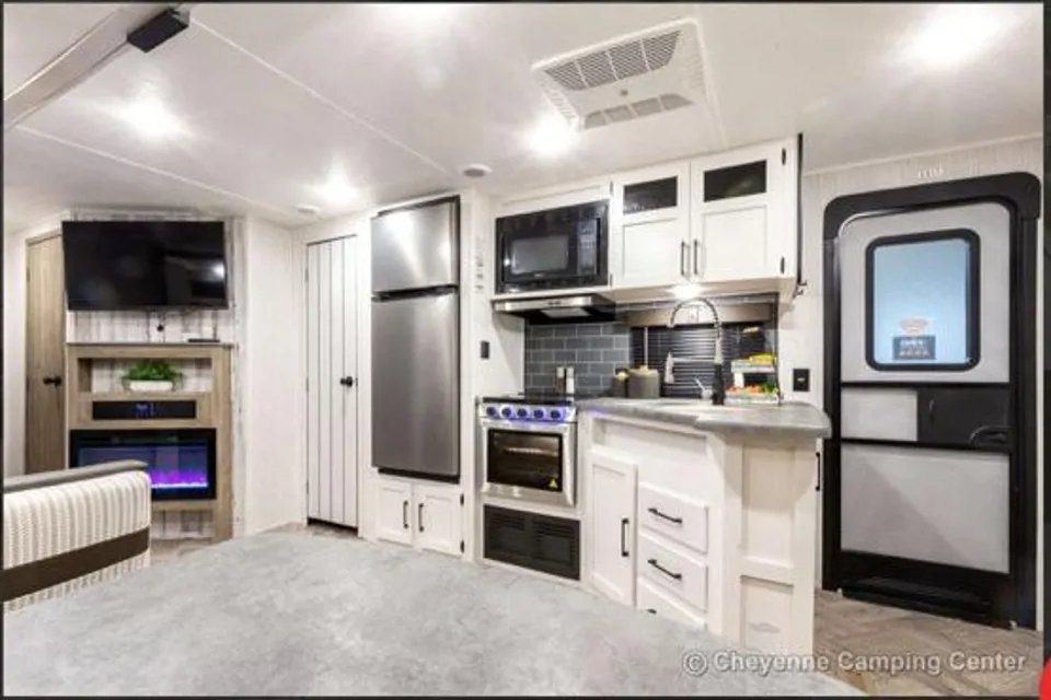 This rear bunk house travel trailer has a great deal of room for the whole family. The bunk house in this camper provides three bunks, along with a sofa that can be an area to sleep as well. The Slide out will give you a Large U-Shaped Dinette and Sofa for seating and sleeping areas as well. Your walk in pantry stores everything you would ever need to make that perfect meal. The exterior, mini camp kitchen features a griddle, a fridge, and a sink for those of you who like to cook outdoors.