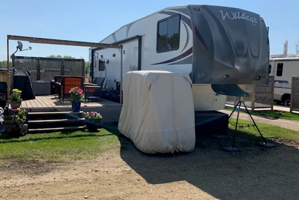 5th Wheel Trailer permanently parked at a beautiful nine hole golf course, Lakewood Golf Resort, at Sylvan Lake, Alberta. Master bedroom with additional sleeping on sofa bed with premium queen air bed. 20 amp power provided. Sewer connected. Fresh water connected. Microwave, A/C, Tassimo Coffee Maker, TV with DVDs, Surround Sound Music System, two rocking chairs, free Wi-Fi. Features adjoining deck complete with patio furniture, shade awning, BBQ, potted flowers and grass, two sets of golf clubs with balls, bags and push carts / trolleys, two adult bicycles. Fire pit with wood. Across from kids playground with swings, slides, climbing gym and basketball net.