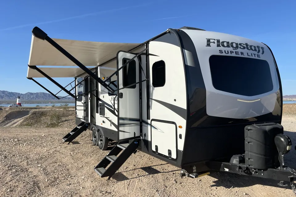 2 Power awning (DO NOT USE UNATTENDED, WIND DAMAGES START AT $700 FOR REPAIR/ REPLACE) with LED lighting for shaded campfires, plus outdoor kitchen goodies like a fridge, sink, or cooktop on some units for cooking under the stars.