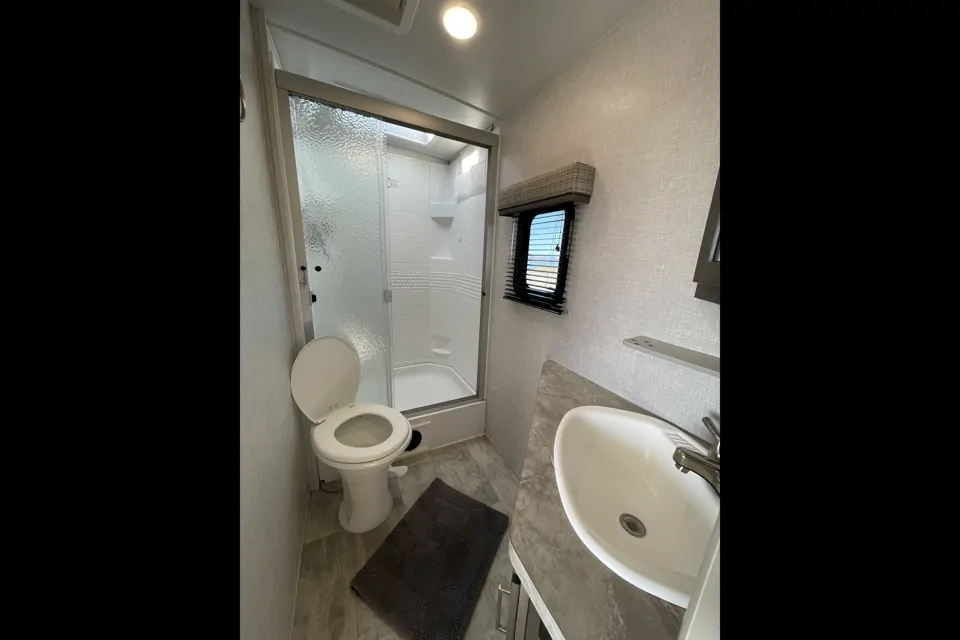 Tech and comforts keep it modern-Western: 2 air-conditioning systems , 13,500–15,000 BTU A/C, 35,000 BTU furnace, 54-gal fresh water, big gray/black tanks (~90/45 gal), power stabilizer jacks, and that classic laminated fiberglass exterior in champagne tones for a tough, good-looking ride. Add in the entertainment package (LED TV, stereo with indoor/outdoor speakers), and you've got a rolling bunkhouse saloon that's equal parts cozy and adventurous.