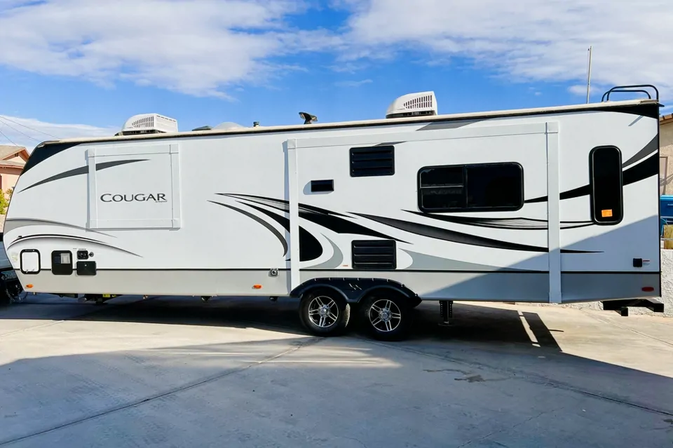 Beautiful 2020 29’ cougar sleeper. Great for anywhere you need to go or relax. This trailer comes equipped with hybrid technology for hot water or heat. Propane/electric or one or the other. Master bedroom comes with legit king size bed for anybody lookin for a little more space to recharge with and 42” tv. Living room is equipped with electric fireplace and 55” tv, two spacious recliners and reclinable couch that also folds to full size bed. Full Kitchen is equipped with workin stove, oven, and fridge along with any amenities needed for camping. Forks, knives, coffee pot, etc. thinking of spending the day outside bbqing with family? This is the trailer for you as it comes with a full outdoor kitchen to cook on and store in food in the outside fridge and even comes with AV hookups outside to watch tv if you’d like or turn on the outside speakers if your just trying to listen to some tunes. Trailer is immaculate and is great for anybody looking for a clean, new and state of the art place to relax and get away.