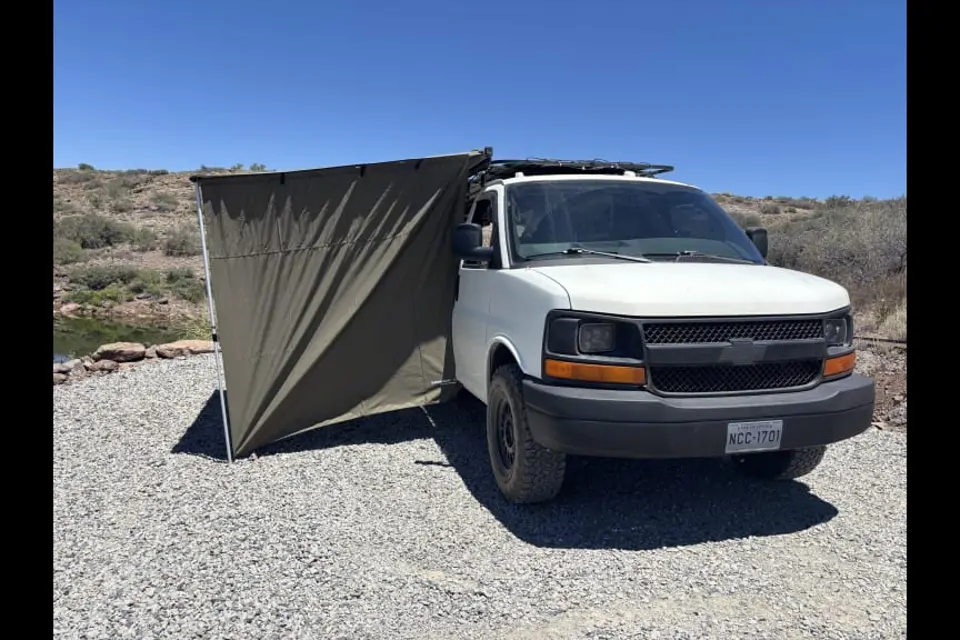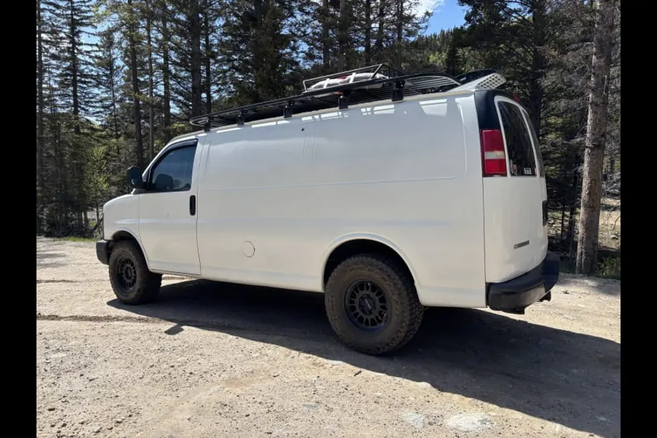 Looking for a camper van to take on or off road? This solar equipped Express van features AWD, 2" lift and 33" A/T tires to get you there. Paint on the van features a rough, matte white finish with AZ pinstriping so you don't have to worry about going through brush!