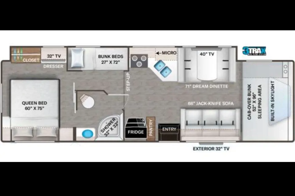 • Two TVs inside for entertainment and an exterior tv for outdoor time