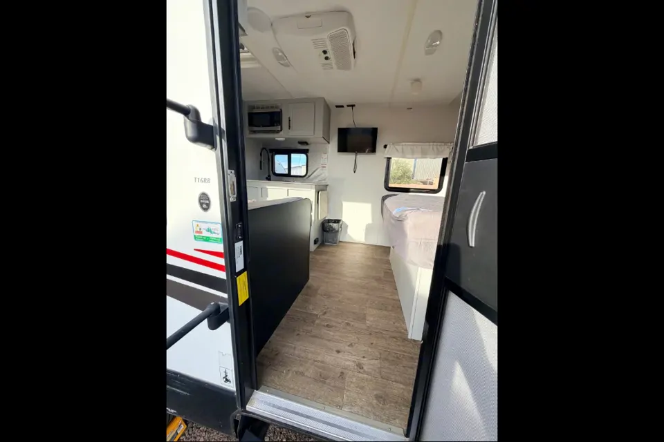 Inside, you’ll find a cozy and efficient layout with everything you need for a comfortable stay — a comfortable sleeping area, kitchenette, and space to unwind after a day of adventure. Its lightweight size makes it easy to tow and perfect for both first-time renters and seasoned campers.