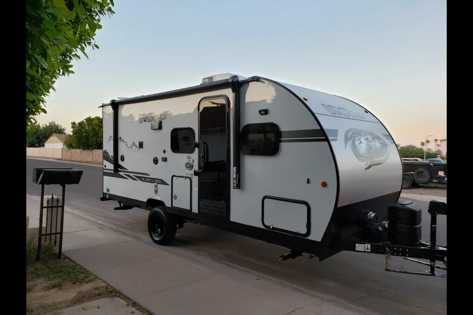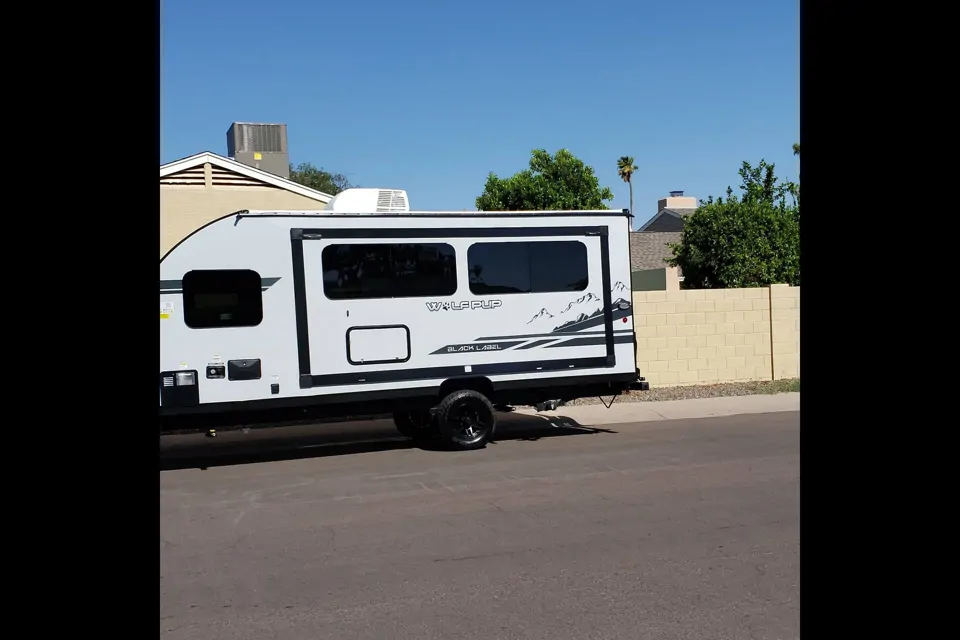 Black Label Wolf Pup Travel Trailer, light weight and easy to tow. Has indoor/outdoor speakers as well as TV hookups. Illuminated outdoor blue lights and an outdoor shower attachment to make rinsing off a breeze. Lots of indoor and outdoor storage. A/C and heat, microwave, 2-burner stove, fridge /freezer, toliet and shower.