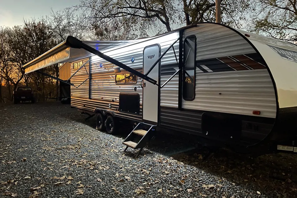 (For faster response message me on Facebook)A modernized, cozy, family-friendly camper that sleeps ten and includes a luxurious like stay. Two bedroom one bathroom. One queen size bed, one queen size pull out bed in second bedroom, two full size bunk beds, pull out sofa and table that turns into beds as well. One 50 inch tv in the living room that sits above the heated, climate -controlled, electric fire place. Accented lights throughout the camper on fireplace, stove, oven, above the oven, and above the railing on the inside of the camper. Spacious shower. Storage that is made to carry multiple totes for an organized stay. Several USB charging ports in both bedrooms. The camper also includes an outdoor kitchen that consists of a mini fridge and a griddle for those days that you want to cook outside under the awning! Included with your stay, we provide RV toilet paper, cleaning supplies, paper towels for cleaning, pots, pans, towels (if requested) and bedding for the master bedroom. Camper has a separate air conditioner for the bunk room and has an oversized electric refrigerator. For entertainment, it includes a Bluetooth Indoor and outdoor speaker radio system.
