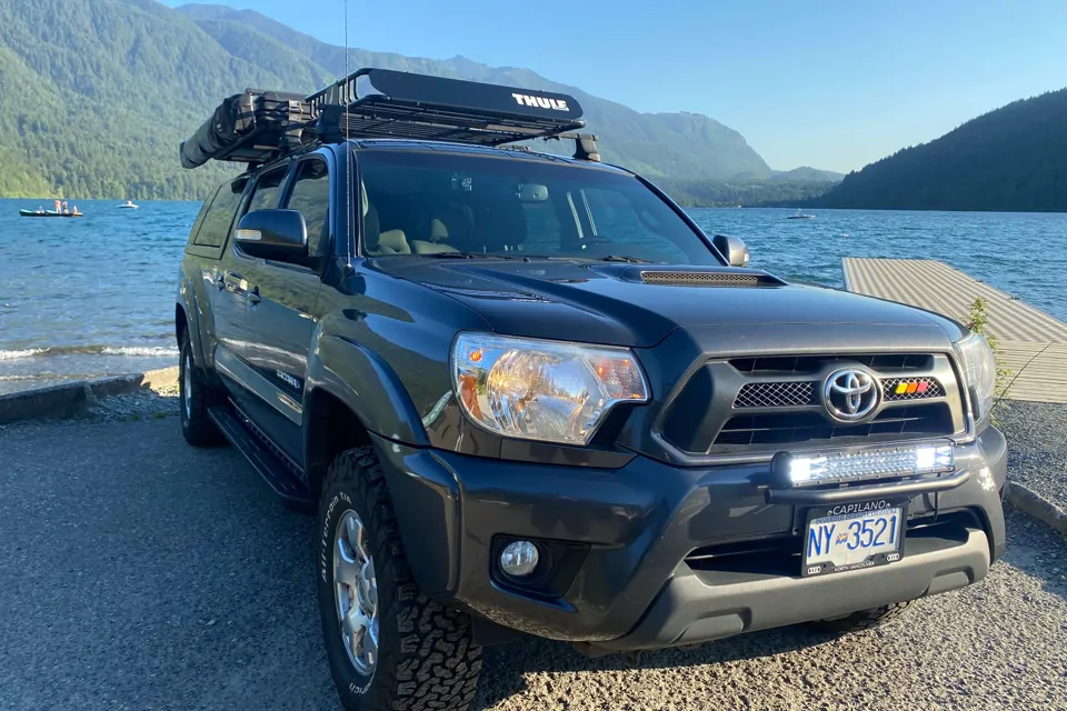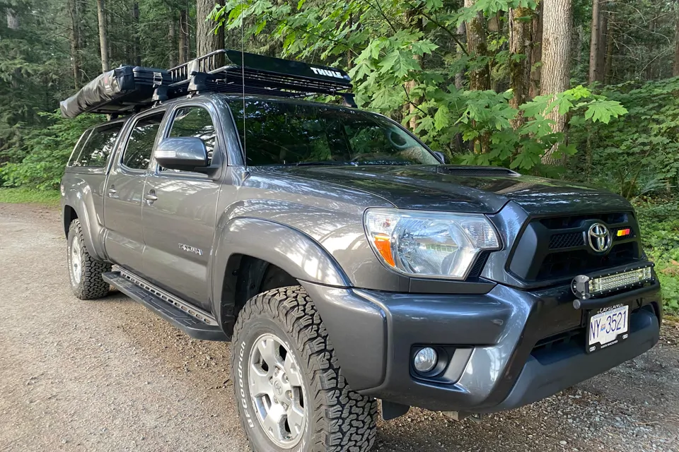 For rental, a 2012 Toyota Tacoma Overlander crew cab fully equipped for your outdoor get away. Vehicle seats 5, roof top tent sleeps 2 adults + 1 small child. For additional guests, an Add-On option is available for a 5 person tent. Recently serviced, and with new KO2 tires, you’re not limited to a crowded campground. Instead, get off the beaten track and follow a random gravel road until you find the perfect secluded spot to set up camp.