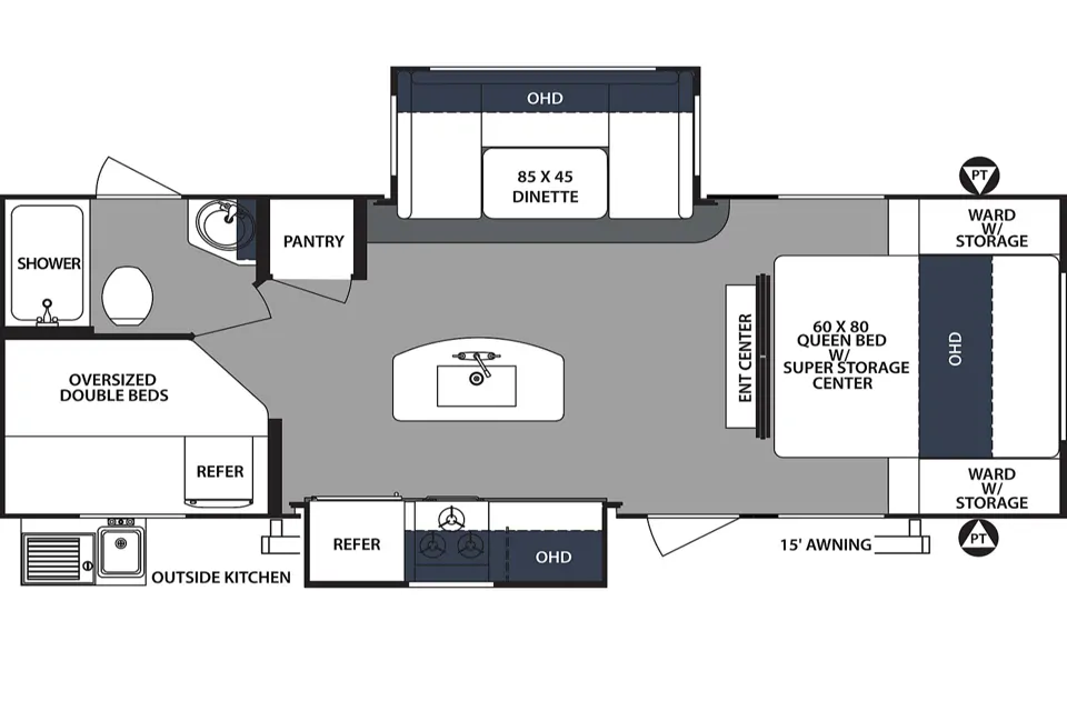 As you enter the travel trailer, straight in front of you there is an entertainment center. To the left of the entrance there is a slide with a three burner range, and refrigerator. On the opposite side of the trailer you will find a u-dinette slide. The slide helps to open up the floor space and gives you a bit more room. Adjacent to the slide there is a large pantry, and in the middle of the kitchen you will find an island with a double kitchen sink.