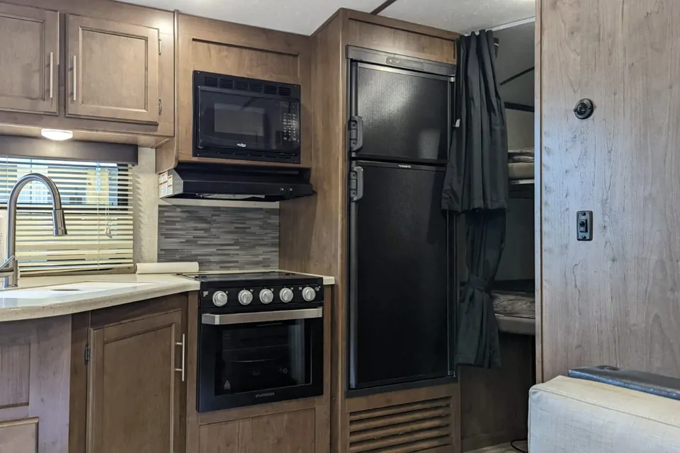 Other features include a convection/microwave oven, 8 cu ft fridge and freezer, separate indoor and outdoor shower, 32 inch LED TV,  bathroom, shower, stereo, 13 foot power awning and ample storage inside and out.Outdoor BBQ fridge. This unit sleeps up to 6 adults and 2 children.