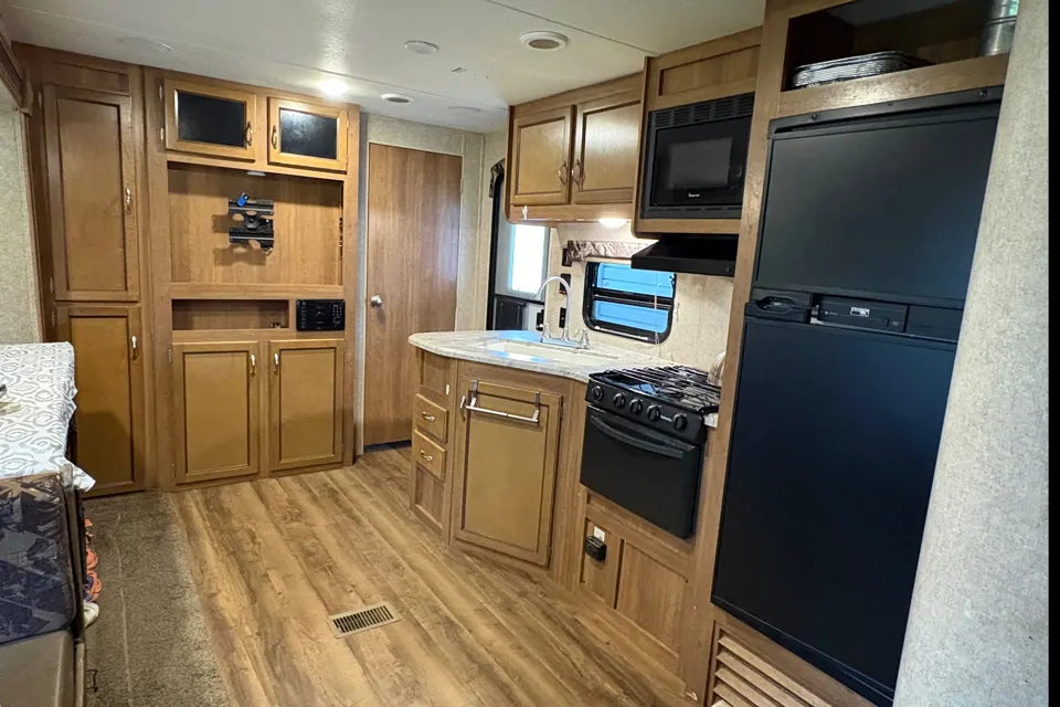 Family friendly 30’ travel trailer, perfect for your next adventure! This unit features a comfortable queen bed up front and two sets of bunk beds in the back. We’ve replaced the couch with built-in dog crates, making it a great setup for guests traveling with pets or needing extra storage. Each bed will have a mattress protector and a fitted sheet ready for you to bring your own bedding of choice. This is a well-loved and well-used trailer, clean, functional, and ready for making great camping memories!