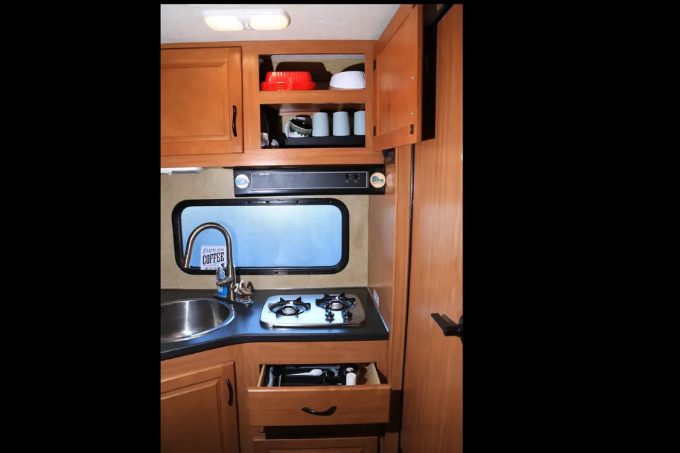 Cultus can fit in any standard parking spot yet has all the equipment and benefits of large rvs. Making this camper truly unique and perfect for any getaway. Kitchen, bathroom, dining area, closets.