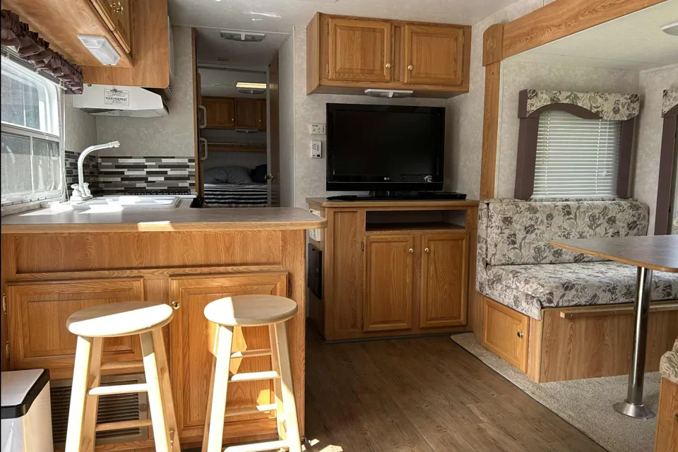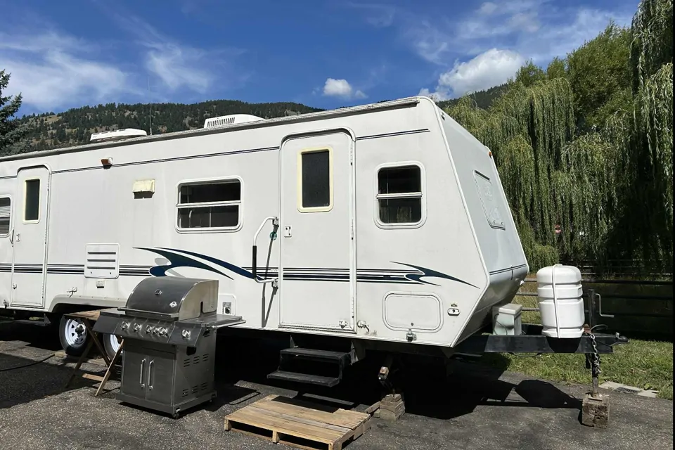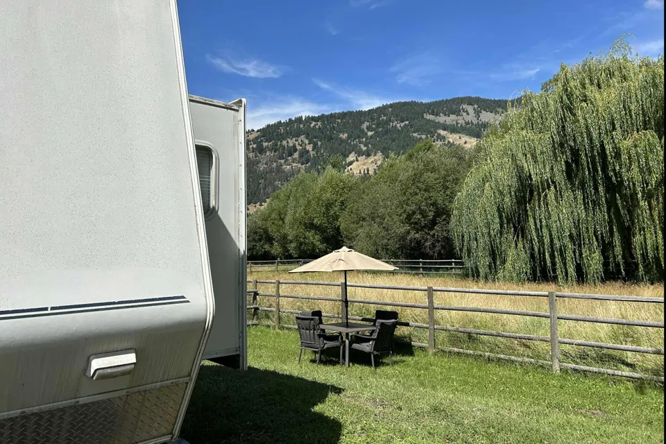 Stay with us! Trailer set up for use on rural property with a beautiful creek flowing by. Paved driveway, with room for parking. Pet friendly. Outside BBQ & eating area. Near to playground, dog park, outdoor pool, floor hockey & basketball nets, and tennis courts. Bed linens and towels provided. Fully stocked kitchen with all the pans, bowls, cups, cutlery and plates needed. Includes toaster, kettle, coffee maker, as well as tea, coffee, sugar, oil, salt & pepper. Tissue, toilet paper included. Pets must be supervised when in trailer. Use of large fenced pen for dog, with shade trees. No smoking. Perfect for family with up to 4 kids. 10 minutes from Vernon, 15 minutes to the beach. Includes septic tank emptying and propane refill. Close to convenience store with off-sales, cidery and bistro. Room for tents, extra cost per each.