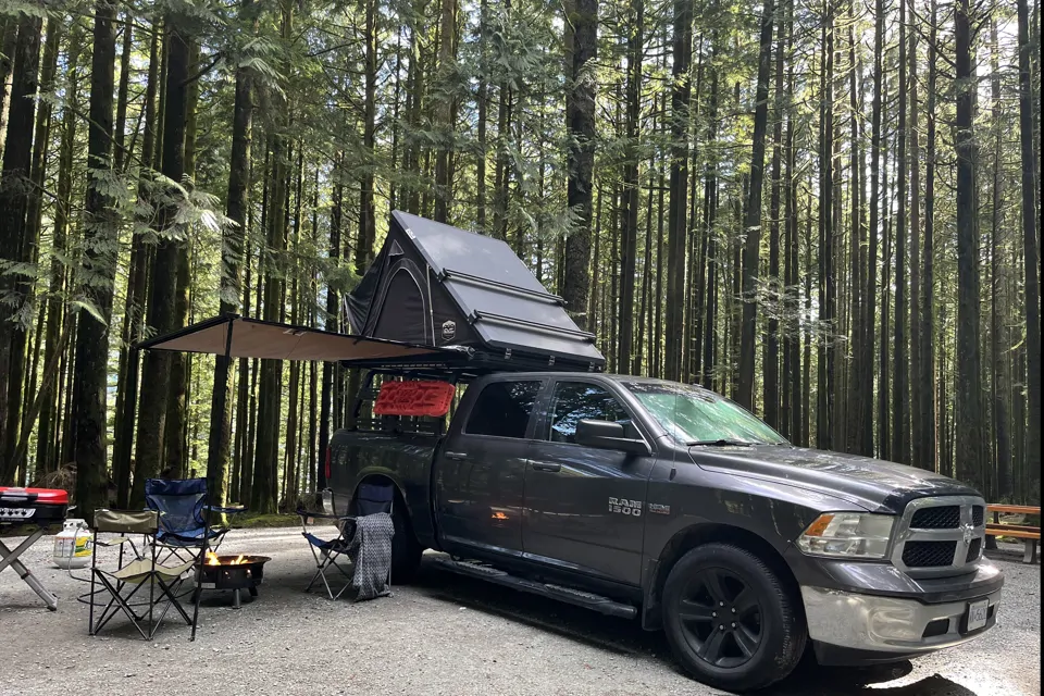 Reliable and spacious 2015 Dodge Ram perfect for camping, road trips and outdoor adventures. The truck comes equipped with a camping tent setup, making it ideal for weekend getaways and exploring nature. hot water outdoor shower, basic camp kitchen set for two, table, camp chairs, portable grill and stove.