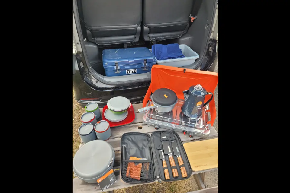 Are you like me? Is getting there half the fun? With the Lil Van from Japan Toyota Voxy All Wheel Drive (Right hand drive), you'll find your balance of comfort and economy during the journey. With the 2.0L engine getting 8L/100km, you can afford to spend more of your holiday budget on experiences, and less on fuel. Park anywhere for the night and don't be afraid to make those trips into town in this nimble, peppy little minivan that looks like a box to maximize interior space. With the second and third row designed to lie flat and interlock, you'll find that even a person over 6ft tall (like myself) has room to spare when sleeping. Top the comfortable seats with a 4" self inflating mattress from SAIL and a North Face Dolomite 3 in 1 double sleeping bag (6"6 long!) and you'll enjoy a great nights sleep. With the side windows rolled down and the included mosquito screens installed by magnets (2 minute set up), you'll have a lovely breeze through the vehicle at night. Top it off with some added airflow and white noise from the included 12V car fan that mounts behind the drivers seat. Stowed away in the Voxy are the cooking essentials, just find yourself a picnic table!