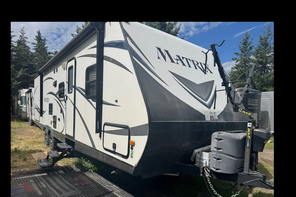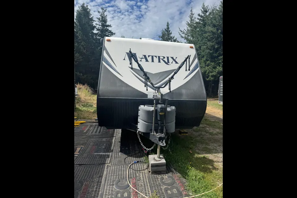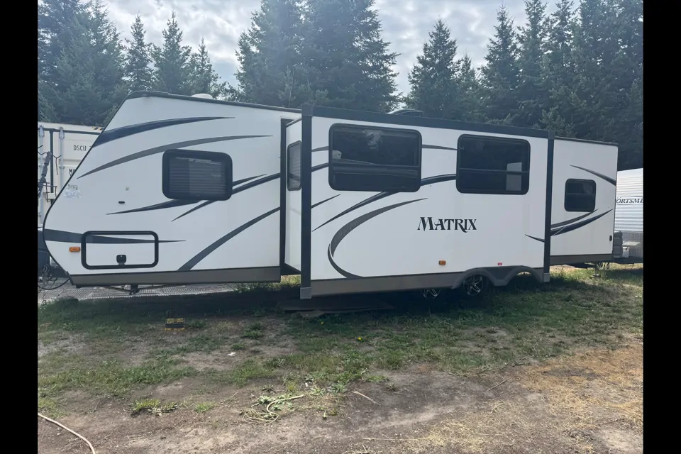 Spacious 28’ family RV sleeps 10 with quad bunk room towards the back, private queen bedroom at the front, convertible sofa and dinette, full bath with tub, plenty of storage, cozy fireplace, TV/DVD, and an outdoor kitchen with fridge, sink, and stovetop—perfect for making memories on the road!